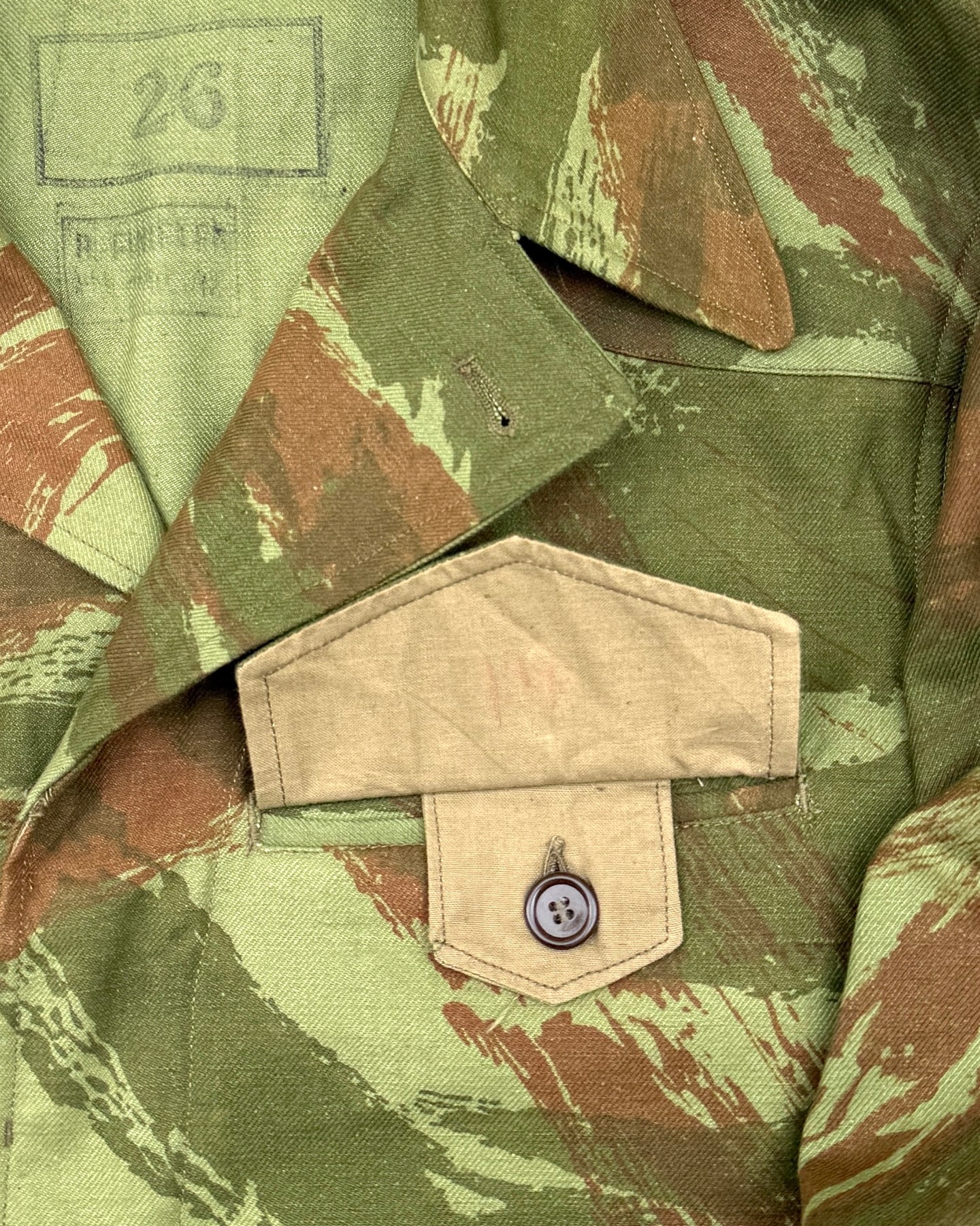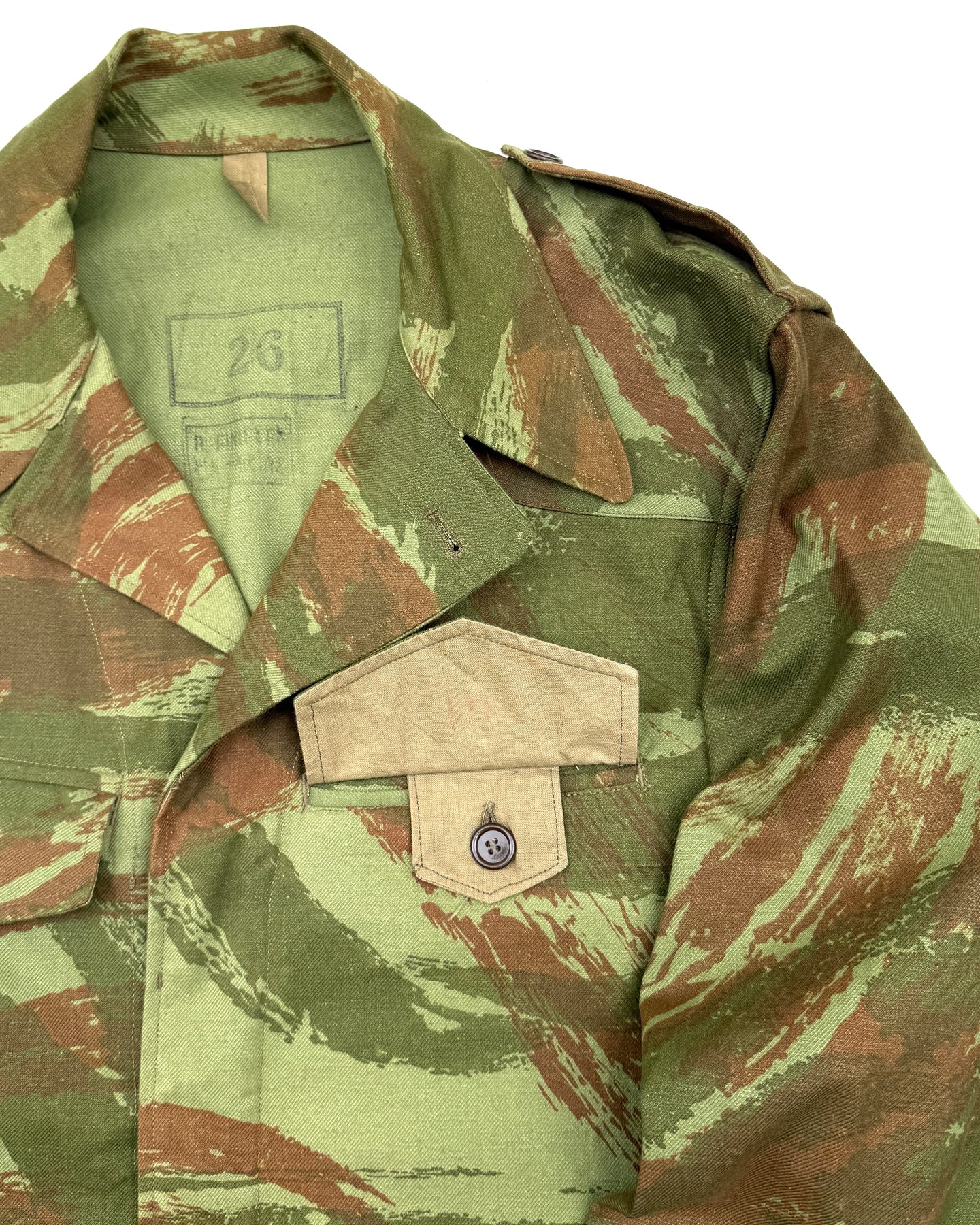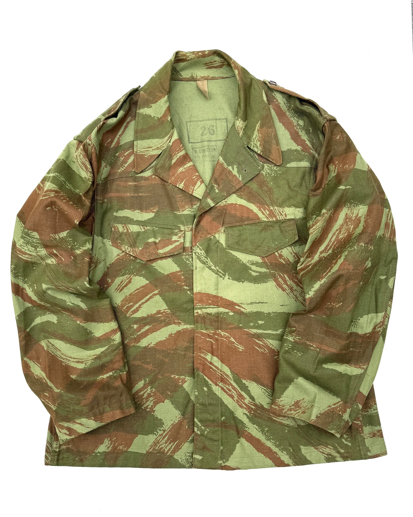 Rare Deadstock 1950's French Army TTA M-1947/52 Modified Lizard Camouflage Jacket, Early Production Dated 1953, Stamped Size 29, All Original Buttons Are Present, Super Fresh Camouflage, Reinforcement Shoulder Pads, Perfect Unworn Condition.