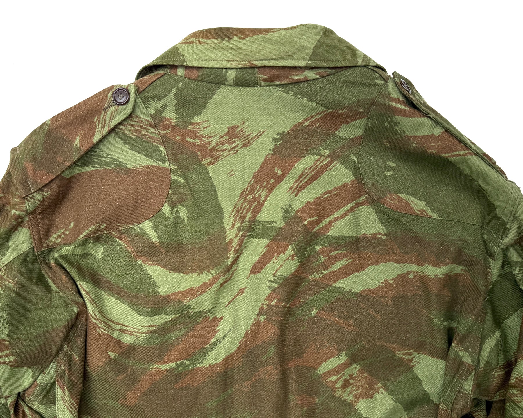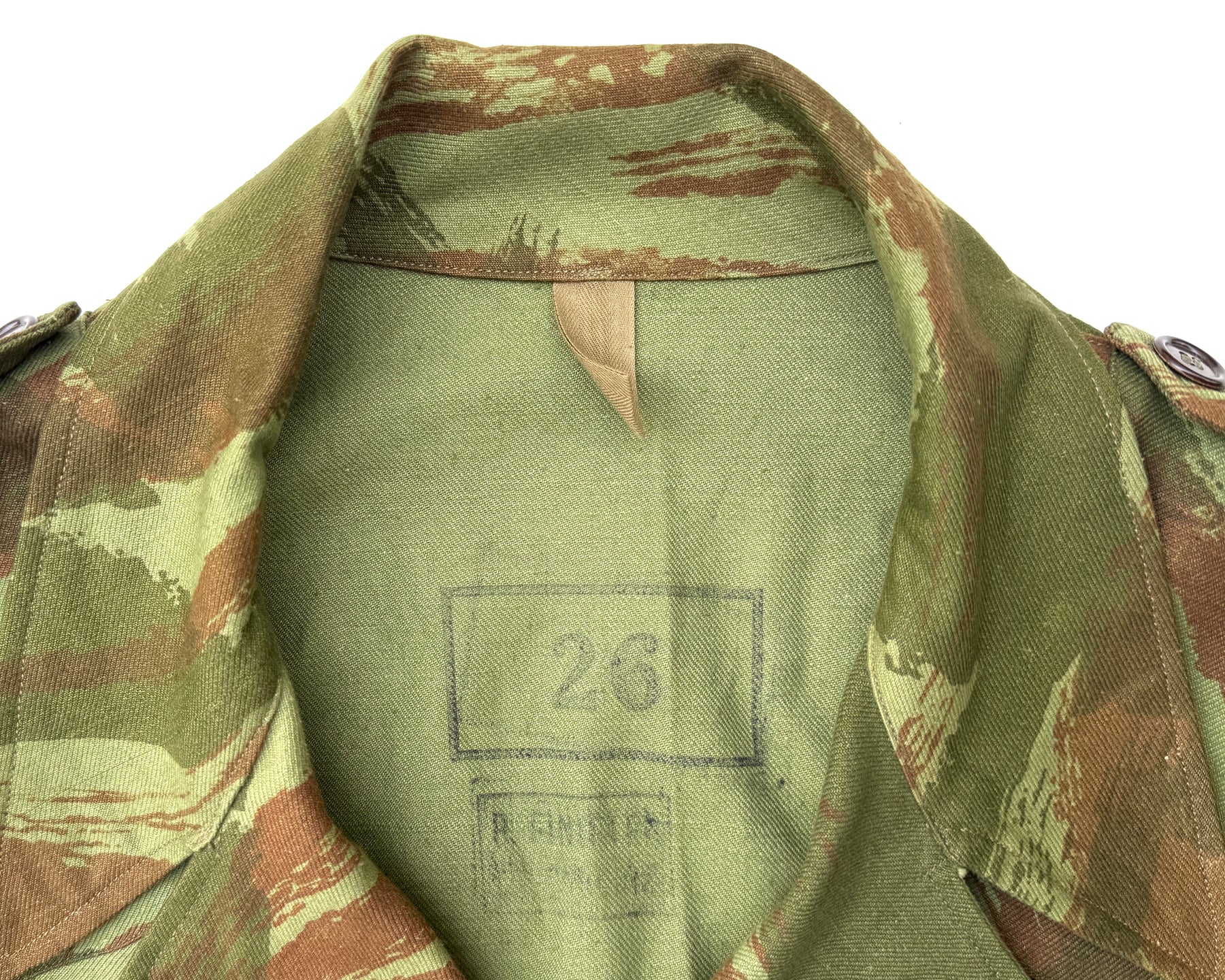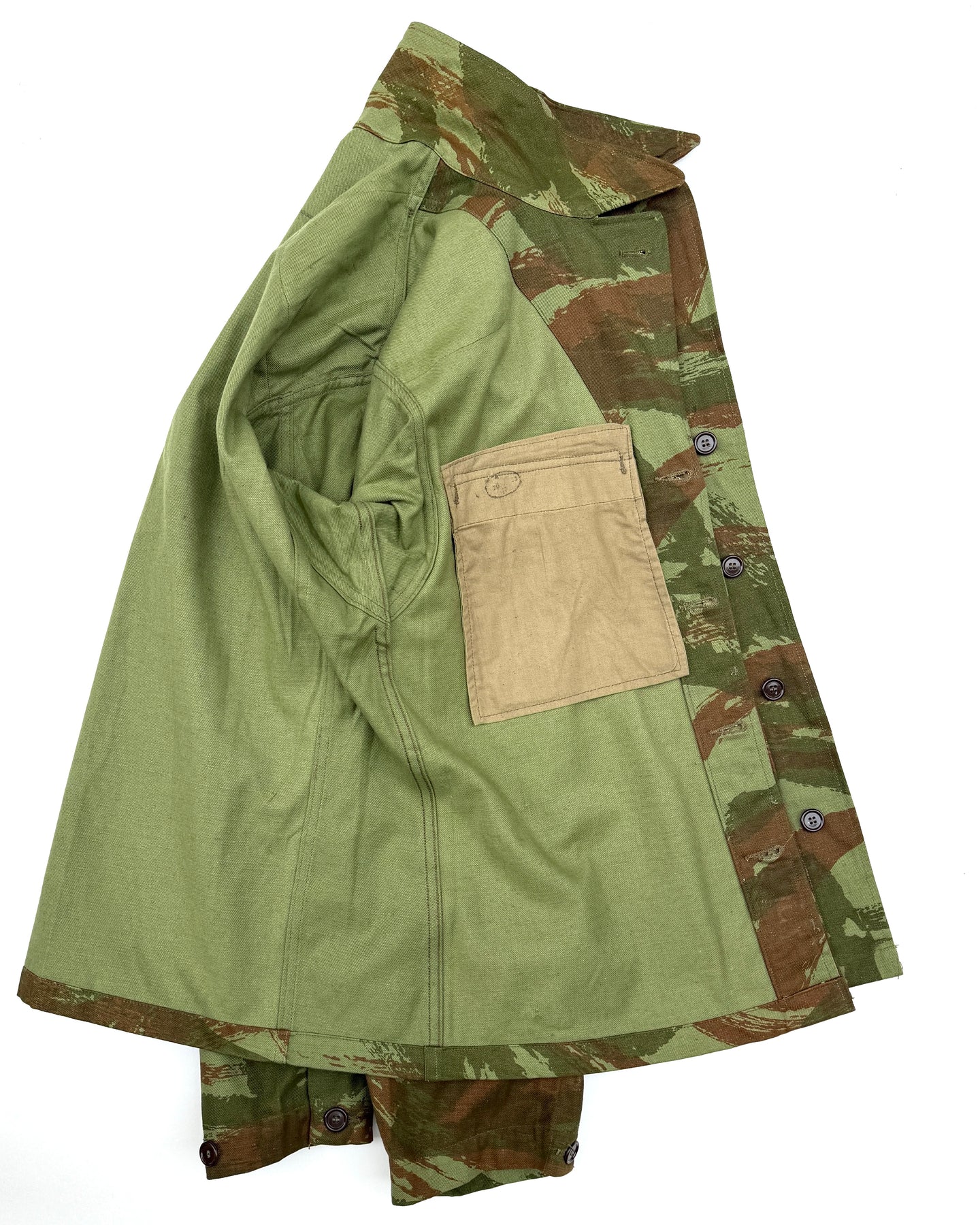 Rare Deadstock 1950's French Army TTA M-1947/52 Modified Lizard Camouflage Jacket, Early Production Dated 1953, Stamped Size 29, All Original Buttons Are Present, Super Fresh Camouflage, Reinforcement Shoulder Pads, Perfect Unworn Condition.