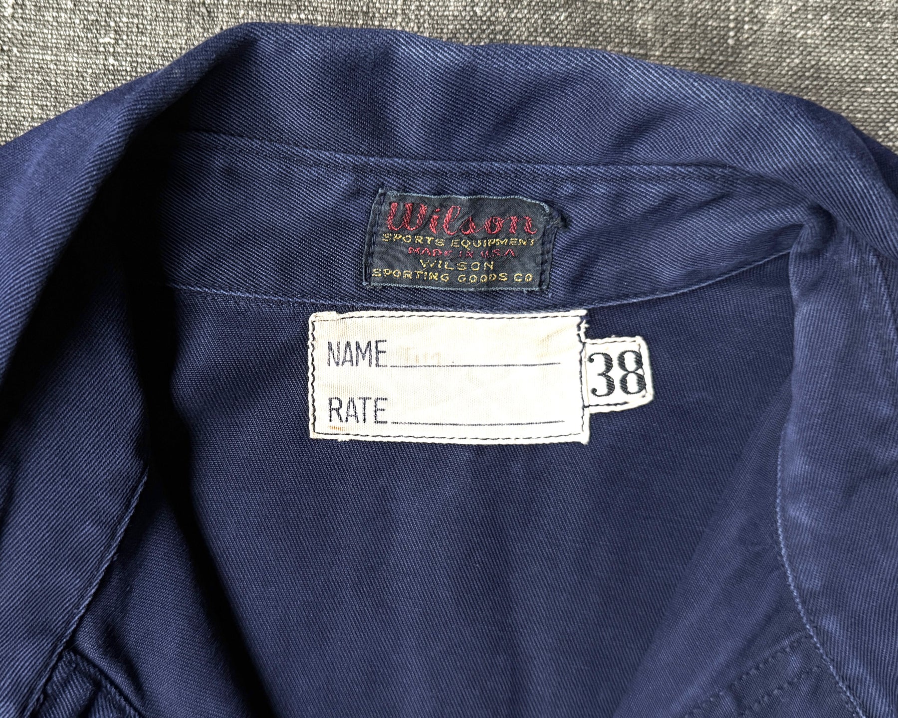 Rare, WW2 U.S Navy / U.S.N Athletic - Sport Pullover Shirt, Made By WILSON ( Sports Equipment Made in USA ), Size Tagged 38, Name / Rate White Cotton Tag, Blue Navy Cotton Canvas Fabric, Dark Blue Wool Cuffs & Waistband In Perfect Condition, Fantastic Vintage Worn Condition.