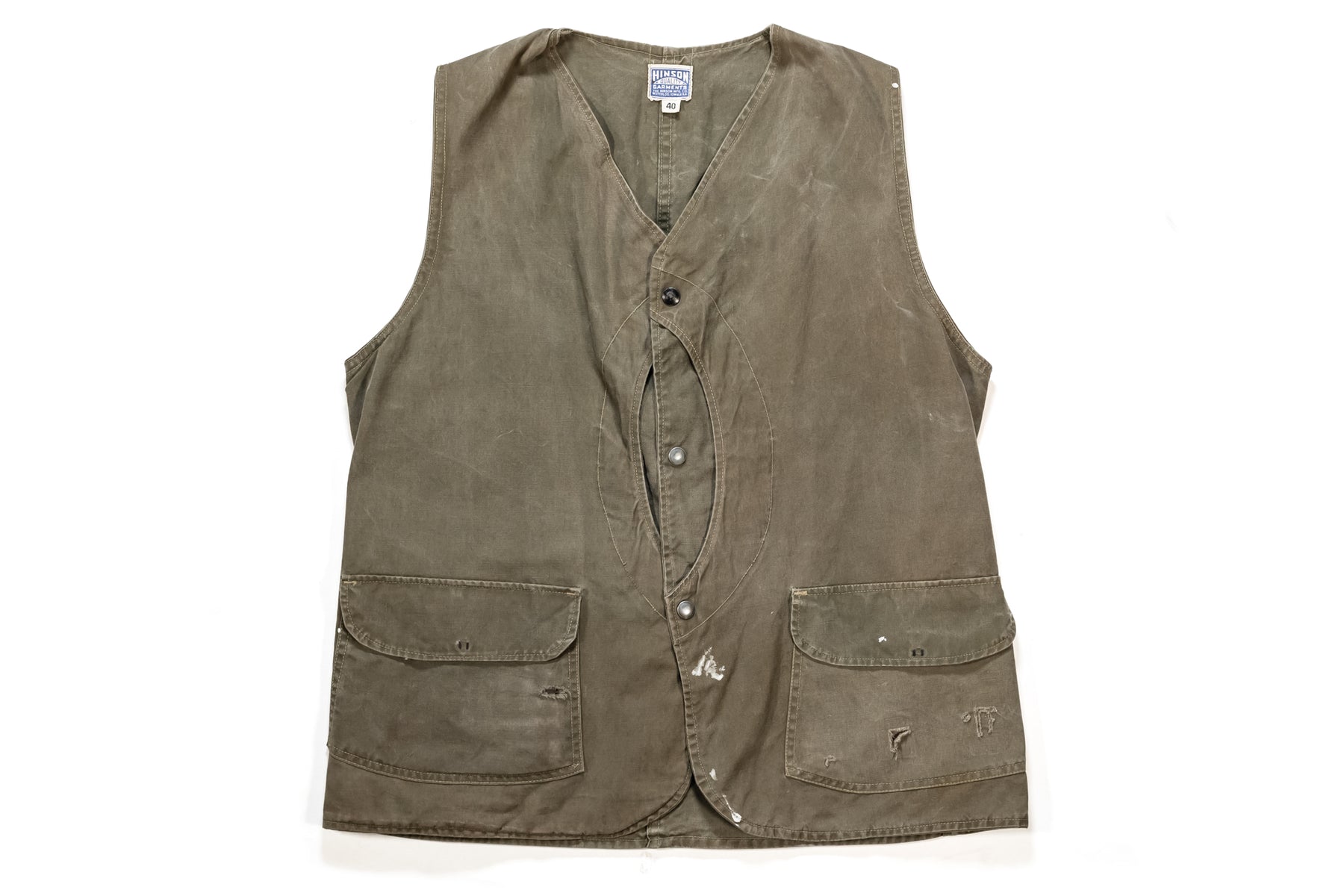 Great 1940's-50's U.S Hunting Vest Half Moon, Made By HINSON, Kaki Canvas Fabric, Snap Buttons, Half Moon Design, Few Holes, Size Tag 40, Cool Worn Vintage Condition.